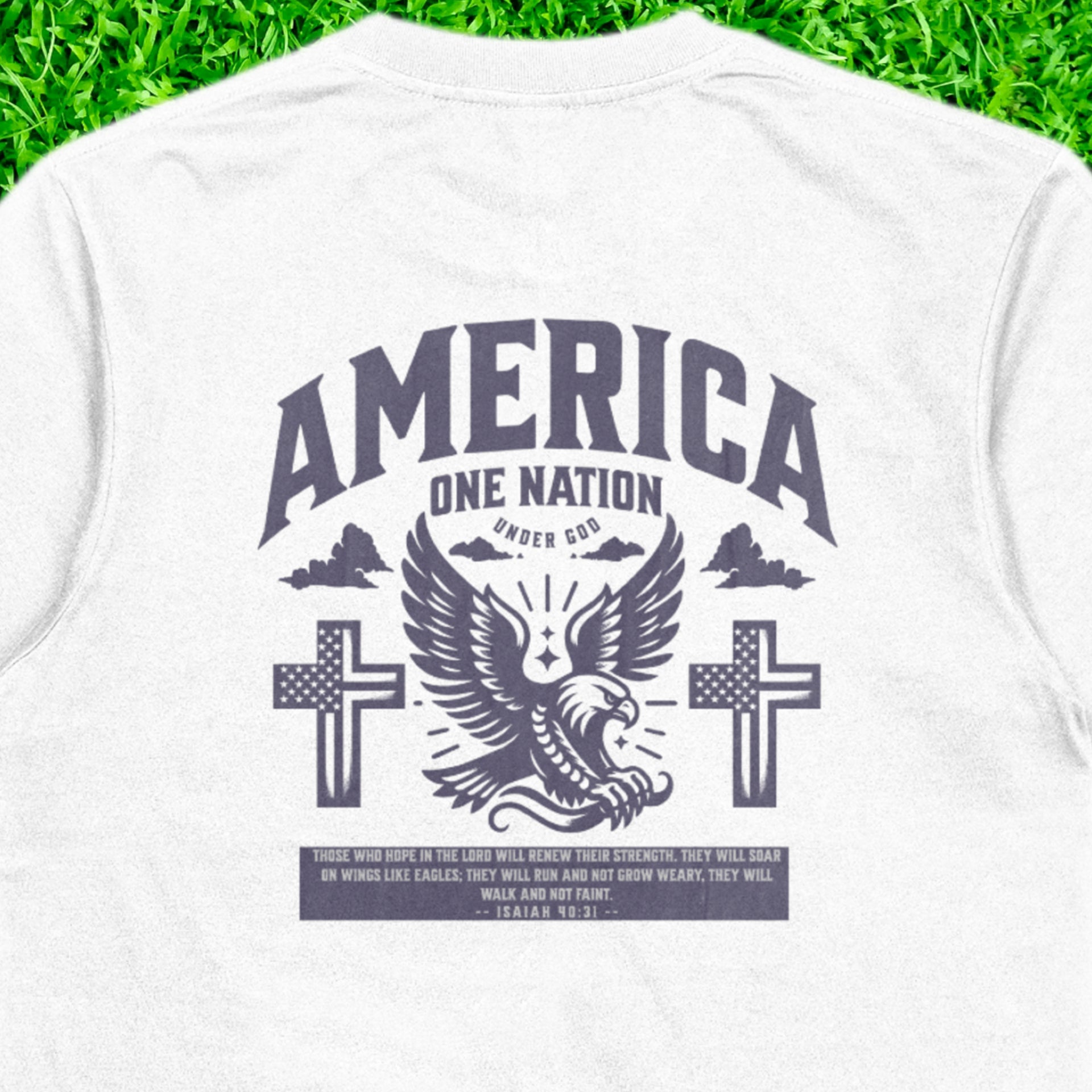 Bold. Patriotic. Faith-filled. This tee proudly reps “America – One Nation Under God” with a powerful eagle design framed by two crosses 🇺🇸✝️.