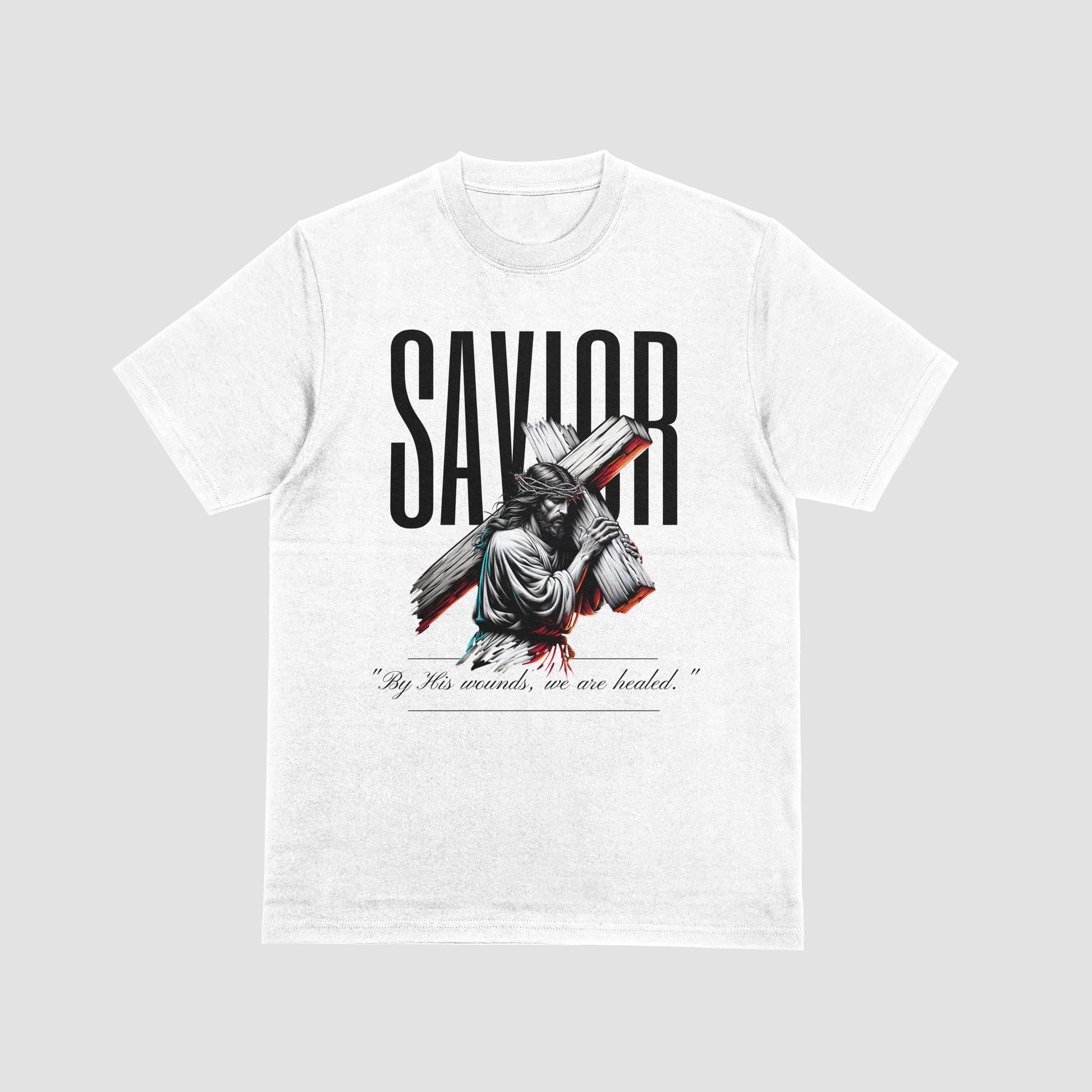 This striking T-shirt design features Jesus Christ, crowned with thorns and carrying the cross on His shoulders—a powerful reminder of His ultimate sacrifice for humanity. The word "SAVIOR" is boldly emblazoned across the top, with the image of Jesus in vivid detail, showcasing the pain and strength in His journey. Beneath the image, the poignant text “By His wounds, we are healed” emphasizes the deep significance of His sacrifice. The vibrant colors used in the image, with touches of red and blue, create a dynamic, emotional visual that is both modern and full of faith.